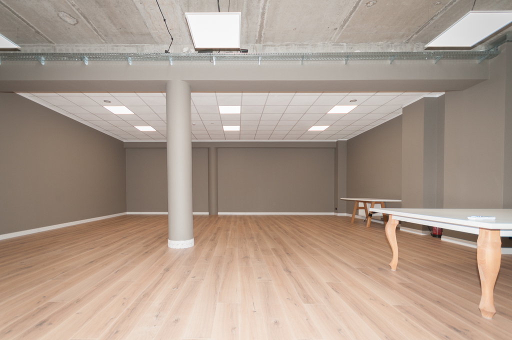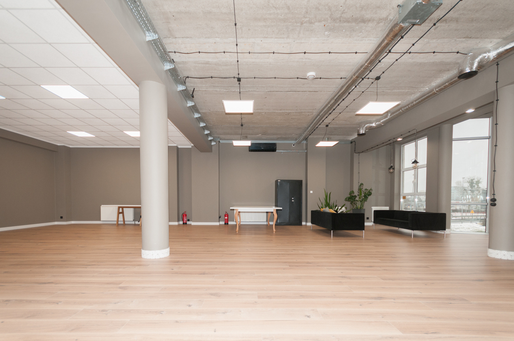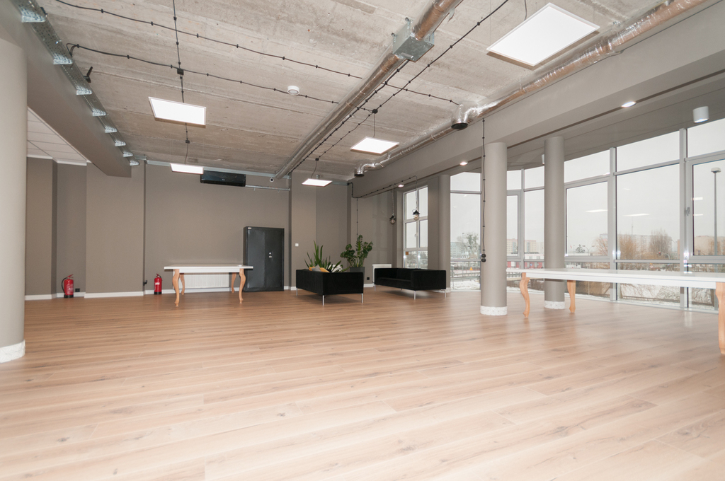 Na podłodze panele, sufity zrobione w stylu loftowym, ogrzewanie z pieca gazowego jak również w części sali głównej zamontowana klimatyzacja z funkcją grzania.