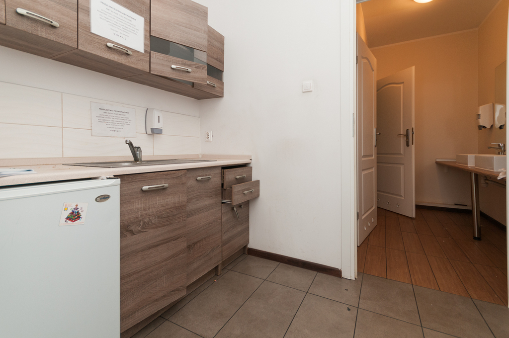 * pomieszczenie socjalne z aneksem kuchennym przez które wchodzi się do sanitariatów