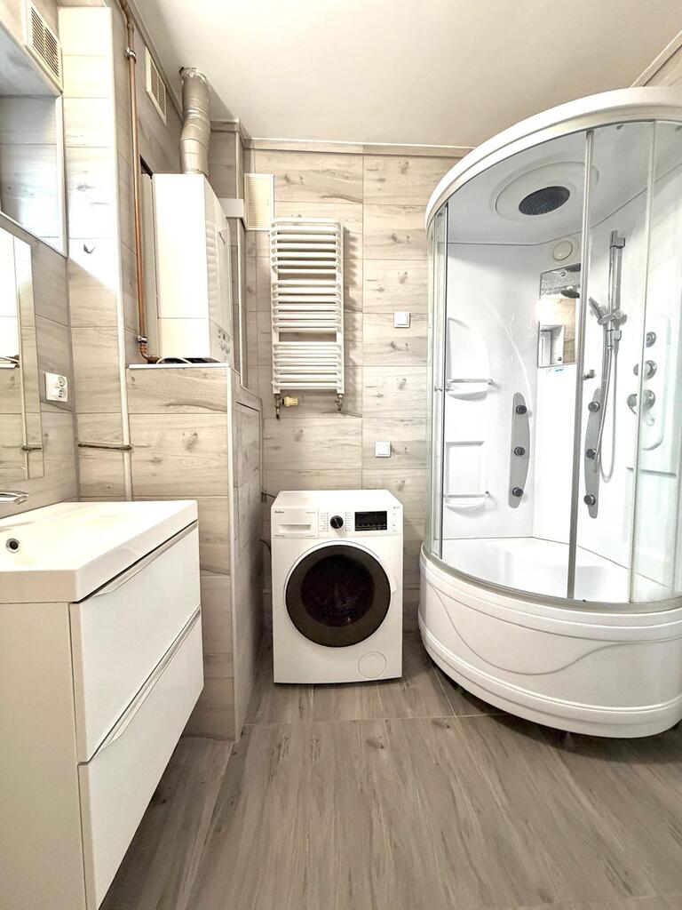 – łazienka z umywalką, WC i przeszkloną kabiną prysznicową,