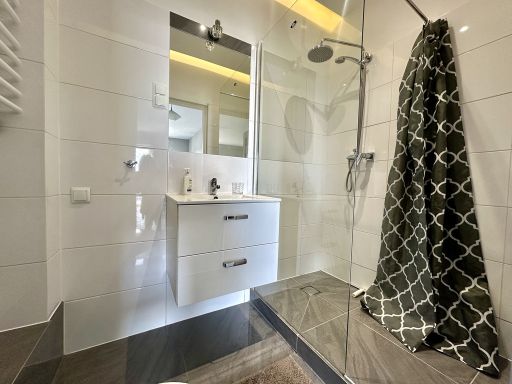 Wnętrze wykończone w dobrym standardzie – gładkie, malowane ściany, na podłogach panele oraz gres. Kuchnia w zabudowie meblowej ze sprzętem AGD: lodówka z zamrażarką, piekarnik elektryczny, płyta grzewcza, pralka, kuchenka mikrofalowa oraz zmywarka. Łazienka i toaleta w glazurze i terakocie. Mieszkanie jest w pełni umeblowane i gotowe do zamieszkania.